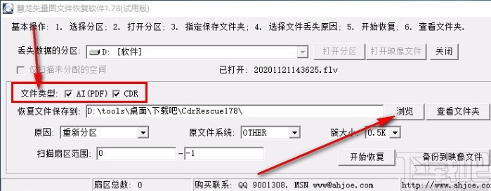 3.打开分区之后等待一会,会出现文件类型这个模块,我们选择想要恢复的矢量图片文件类型,勾选之后点击浏览按钮可以设置恢复之后文件的储存位置。