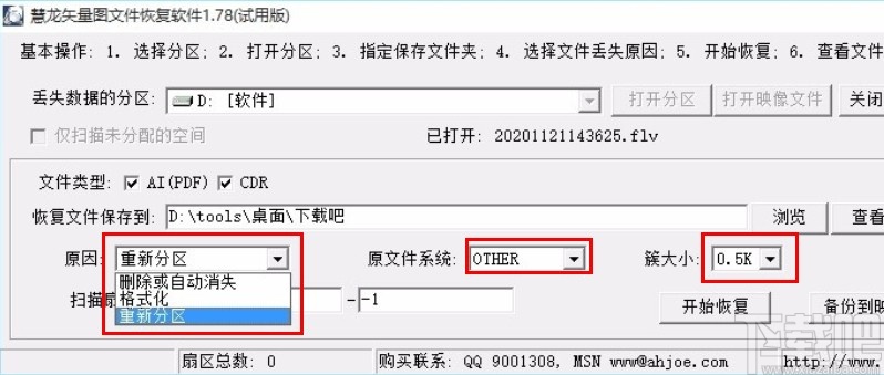 5.点击确定按钮设置好恢复文件保存路径之后,下一步根据自己的需求选择文件丢失的原因和原文件系统、簇大小,设置之后进入到下一步。