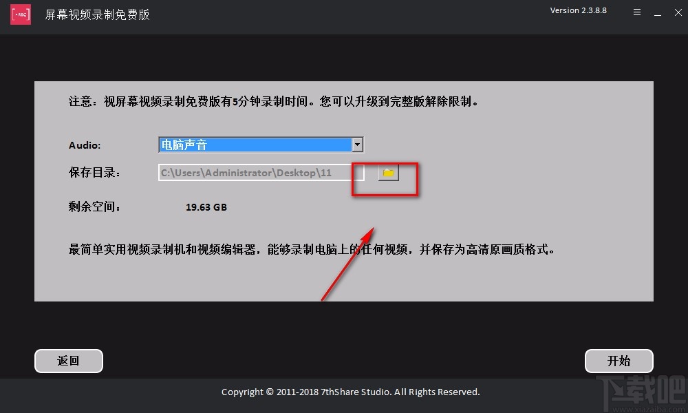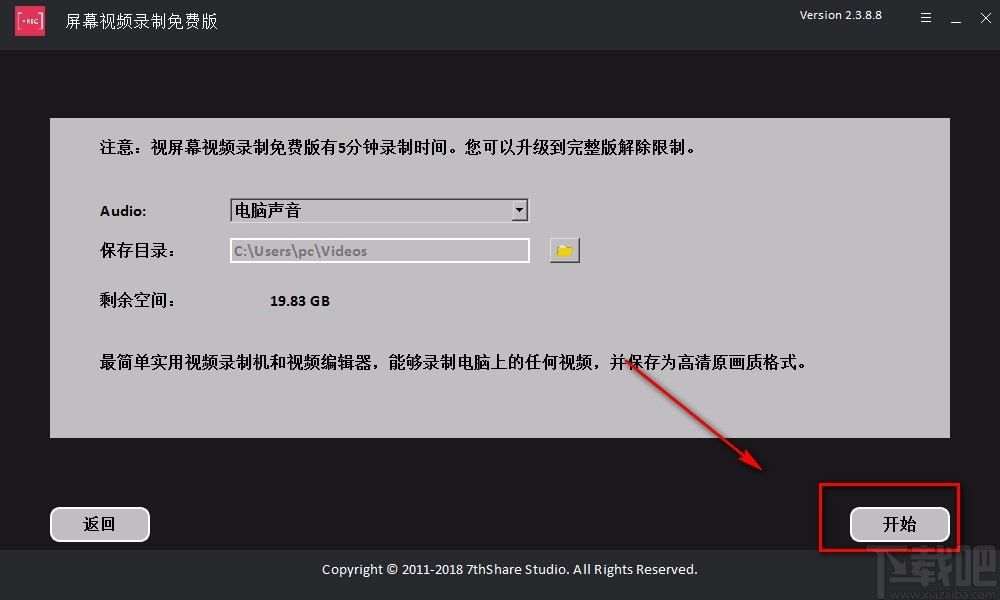 5.完成以上所有步骤后,我们在界面右下角找到“开始”按钮,点击该按钮就可以开始录制电脑屏幕了。