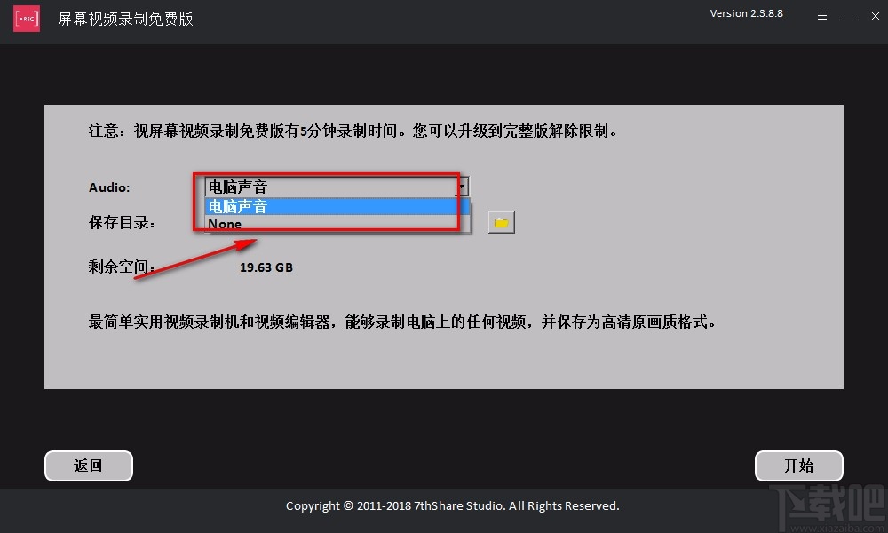 2.接着界面上就会出现一个如下界面,我们在界面上找到“Audio”选项,点击该选项后面的下拉按钮,在下拉框中选择是否录制电脑声音。
