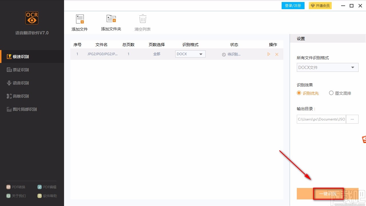 6.完成以上所有步骤后,我们在界面右下角找到“一键识别”按钮,点击该按钮就可以开始识别图片文字了。