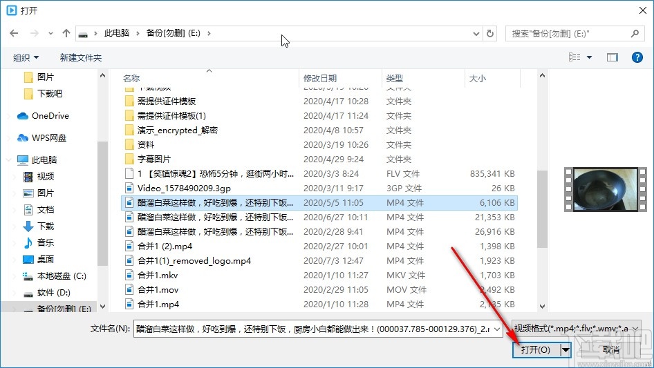 2.点击这个添加文件图标之后,下一步界面中会出现一个选择文件的界面,我们根据自己的需求来选择想要压缩的视频,选中之后点击右下角的打开按钮。