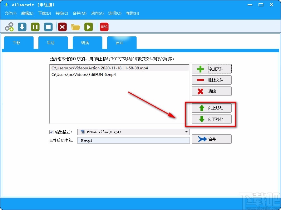 4.将视频文件添加到软件后,我们选中视频,再点击“向上移动”、“向下移动”按钮,就可以调整视频合并的顺序。