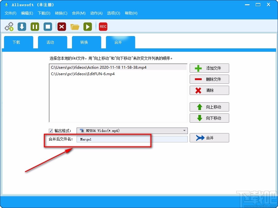 5.然后在界面下方找到“合并后文件名”选项,该选项后面有一个文本框,我们根据自己的需要在文本框中输入合并后的文件名称。