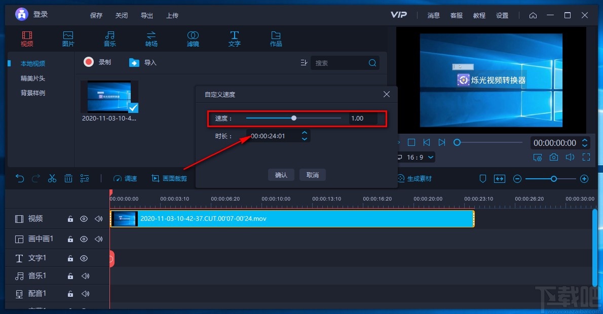 7.在窗口中还可以找到“时长”选项,我们根据自己的需要在该选项后面的文本框中设置播放速度调整的时长,并点击“确认”按钮即可。