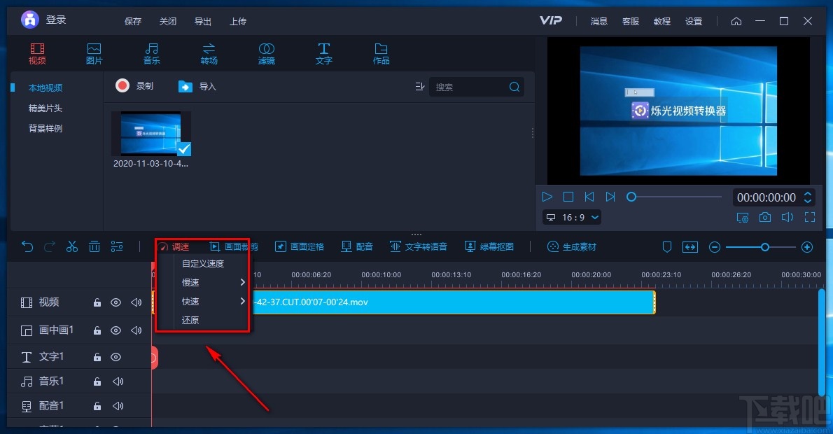 5.紧接着在时间轨道上方找到“调速”选项,我们点击该选项会出现一个下拉框,根据自己的需要进行选择。