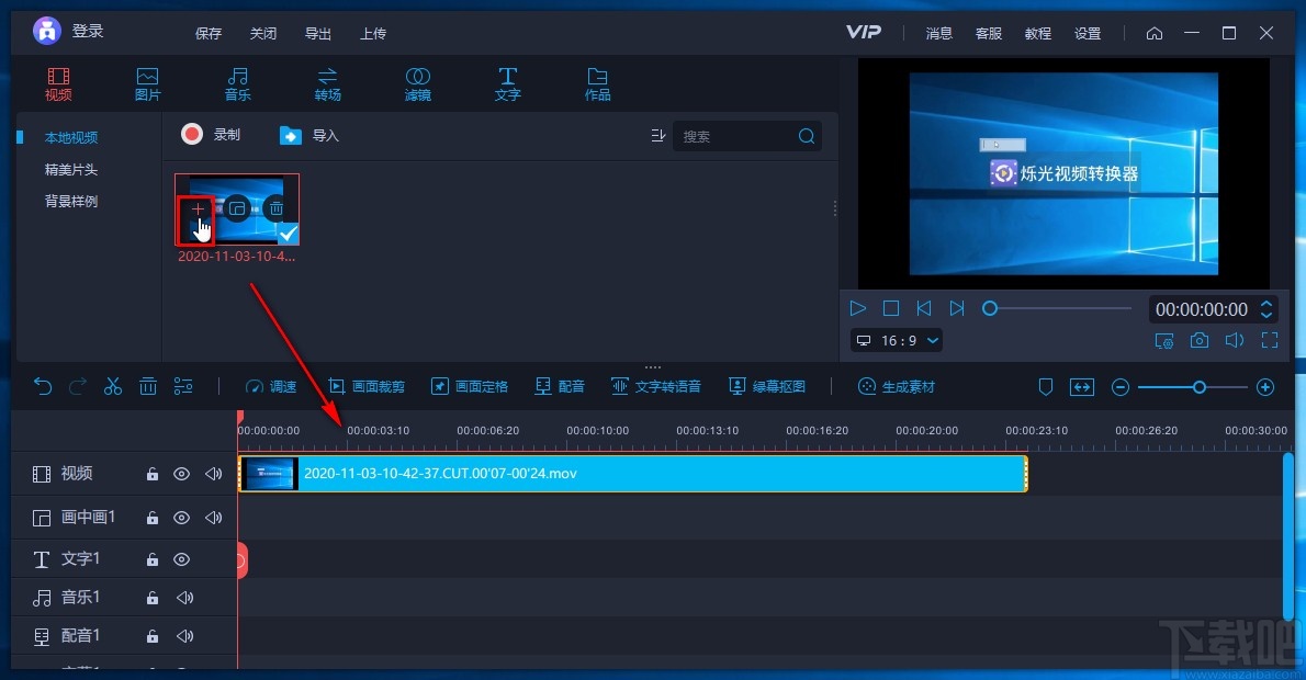 4.将视频添加到软件后,我们将鼠标移动到视频上,视频上会出现一个加号图标,我们点击这个图标就可以将视频添加到下方的时间轨道上。