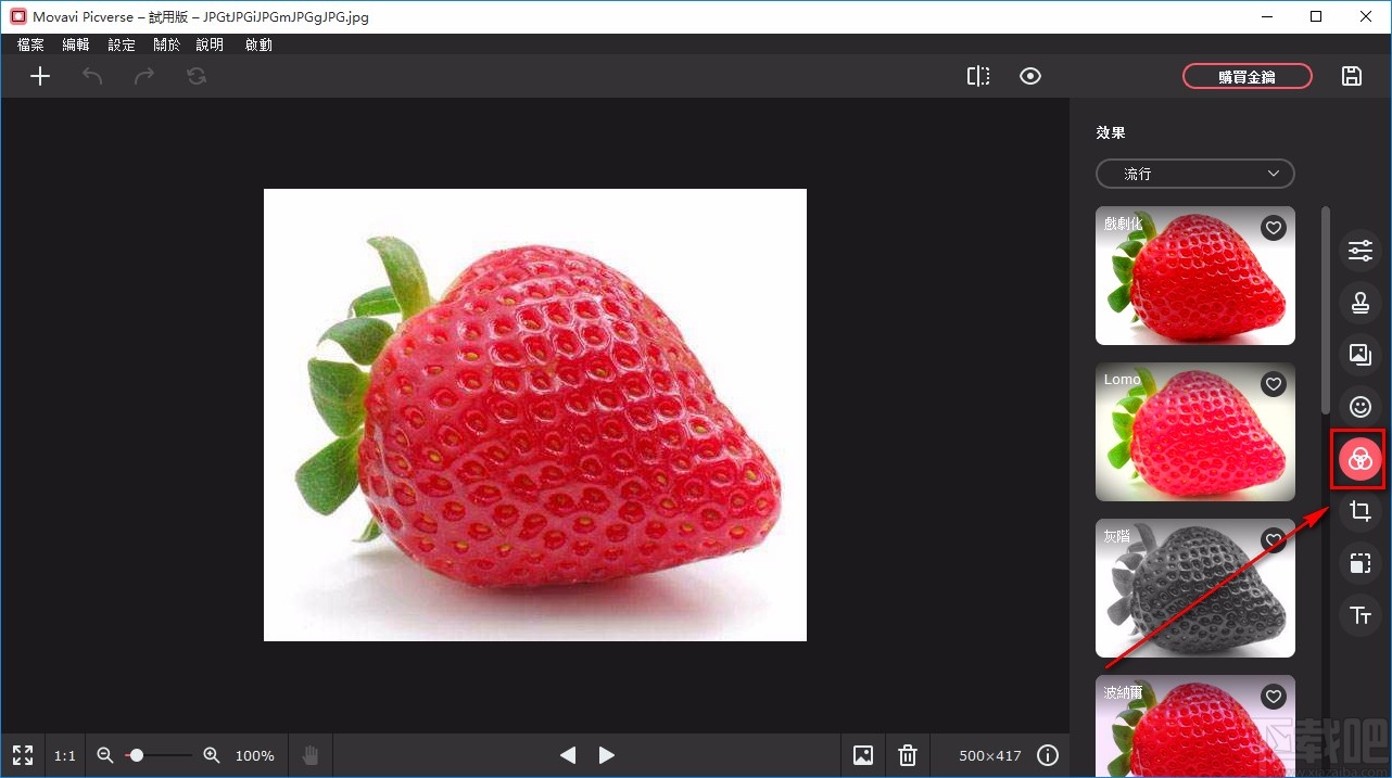 3.将图片添加到软件后,我们在界面右侧找到下图所示的效果按钮,点击该按钮再进行下一步操作。
