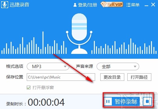 6.电脑声音录制完毕后,我们在界面右下角点击“暂停录制”按钮,或者点击停止录制按钮,就可以停止录制,并将录制的音频文件保存在电脑中。