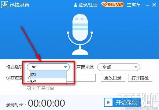 1.首先打开软件,我们在界面上找到“格式选项”,点击该选项后面的下拉按钮,在下拉框中设置录音格式。