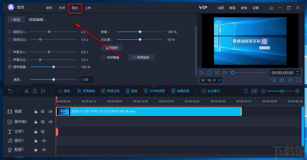 8.完成以上所有步骤后,我们在界面左上方找到“导出”按钮,点击该按钮就可以将视频导出软件了。