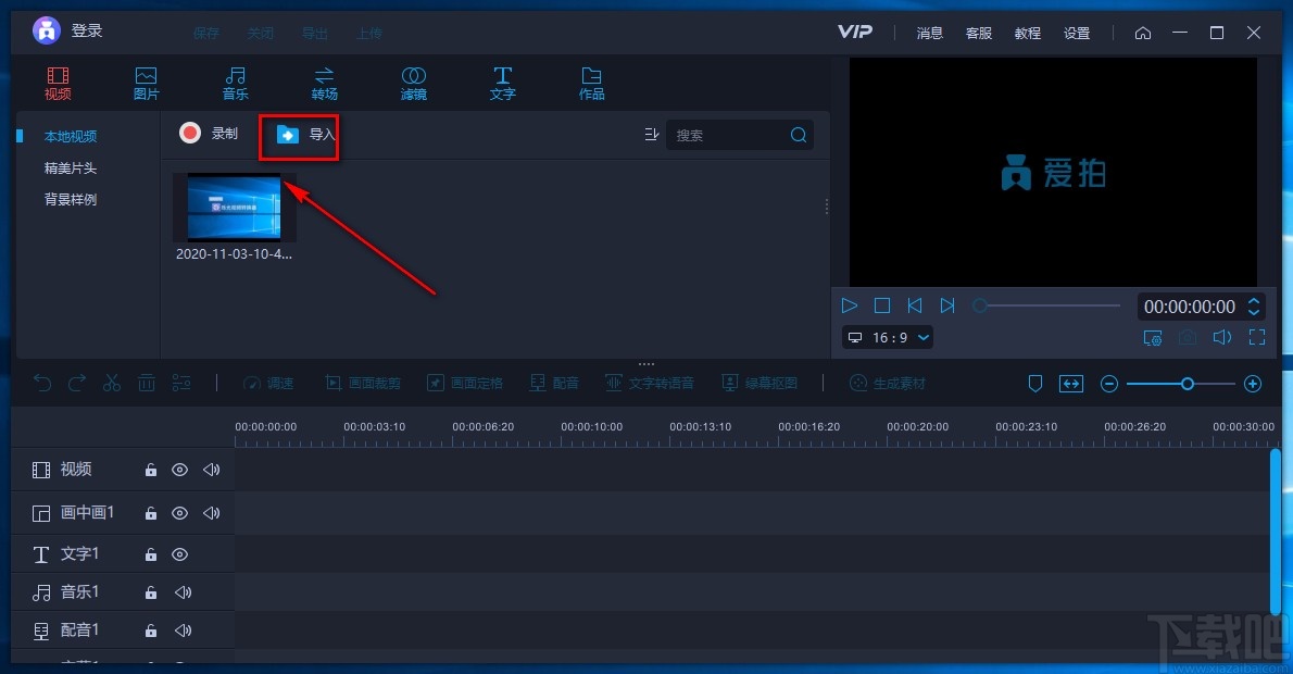 2.接着在视频编辑页面中,我们在页面左上方找到“导入”选项,点击该选项可以打开文件添加页面。