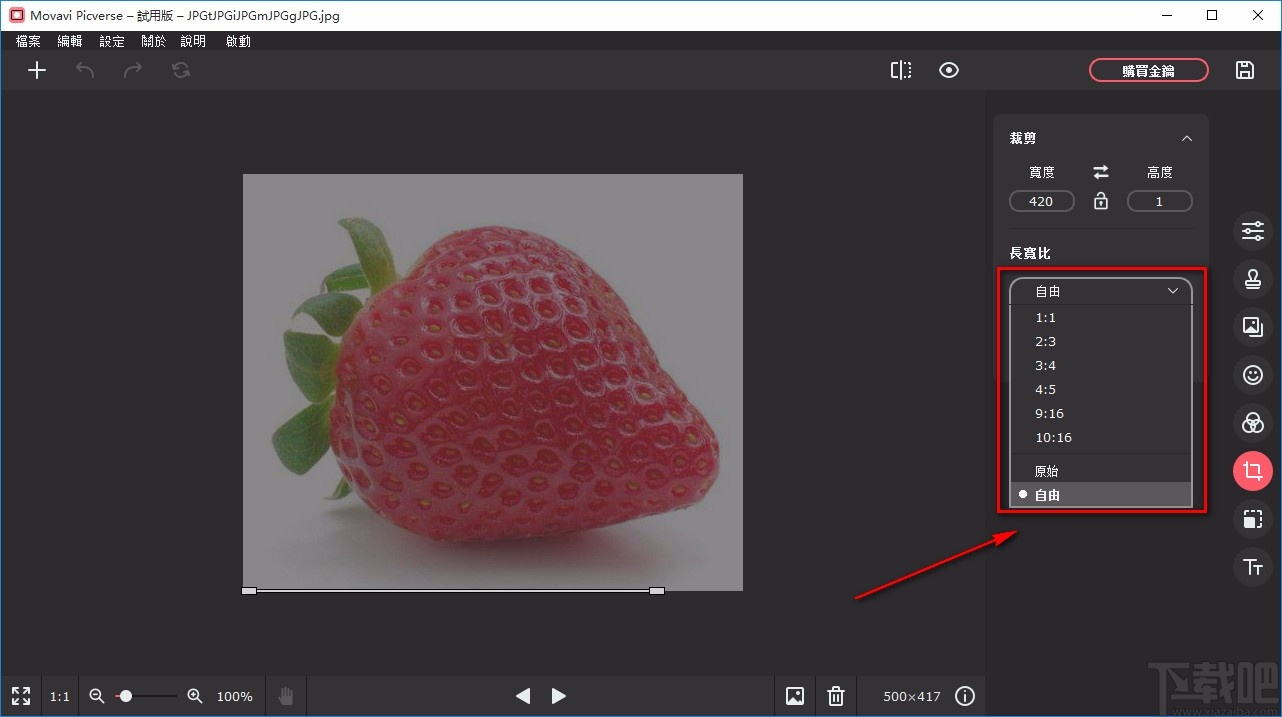 6.在界面右侧还可以找到“长宽比”选项,我们可以点击该选项下方的下拉按钮,在下拉框中设置图片裁剪的长宽比。