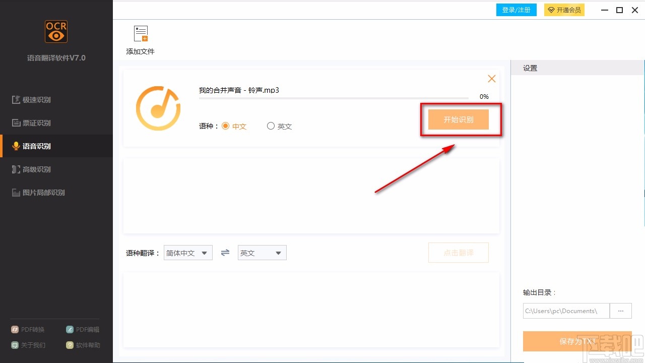 7.完成以上所有步骤后,我们在界面上方找到“开始识别”选项,点击该选项就可以开始识别语音了。