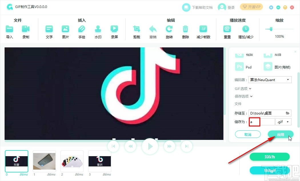 8.最后一步设置好保存位置之后输入储存GIF文件的名称,点击这个导出面板中的应用按钮,点击即可将它保存到电脑中。