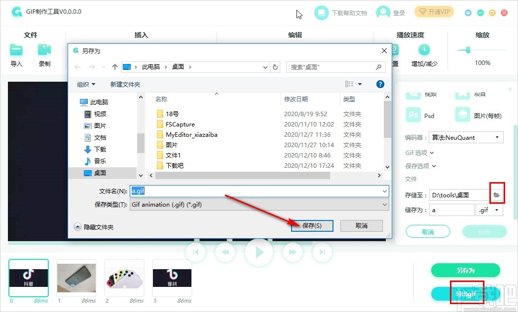 7.想要保存制作的GIF文件时点击右下角的导出GIF这个功能按钮,在出现的面板中找到存储至选项右边的文件夹图标,然后在出现的界面选择好保存的文件夹即可。