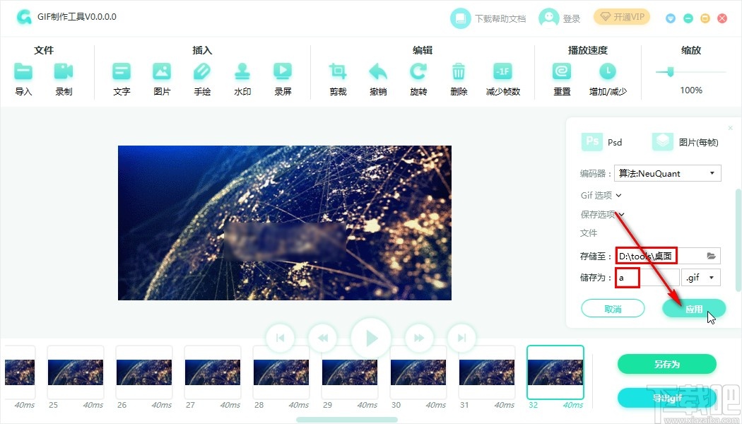 6.点击这个导出之后,下一步我们在导出面板中设置好储存路径和文件名称之后点击应用按钮就可以保存这个裁剪之后的GIF图片了。