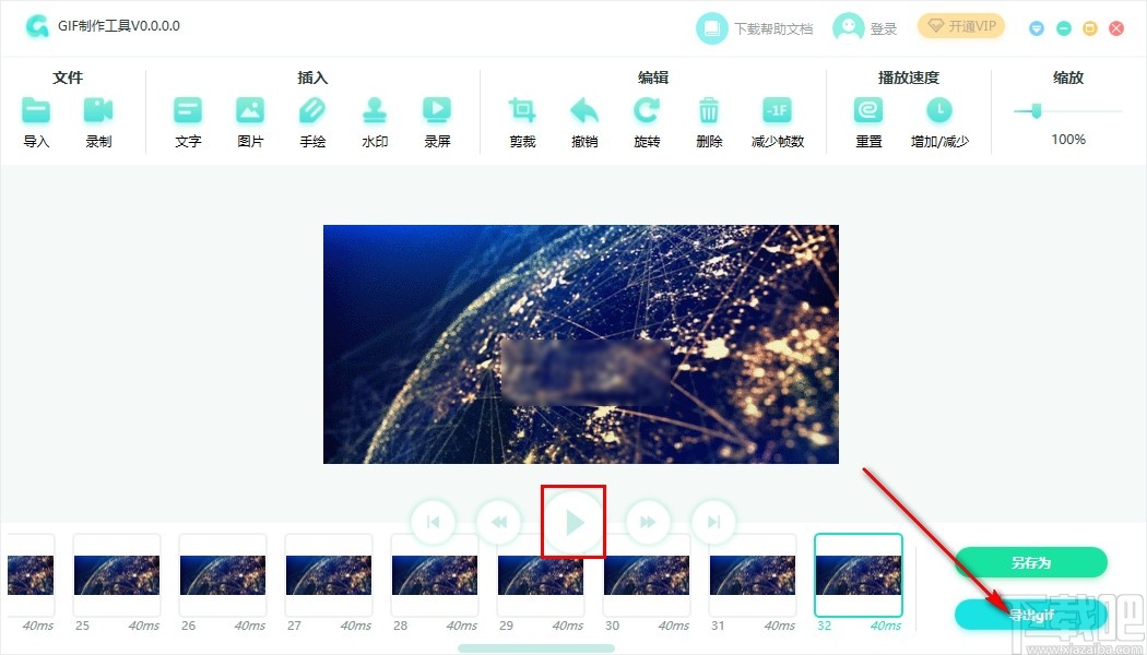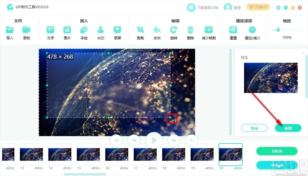 5.点击这个应用按钮之后完成裁剪操作,可以点击播放按钮预览裁剪之后的效果,点击右下角的导出gif按钮可以将它导出保存下来。