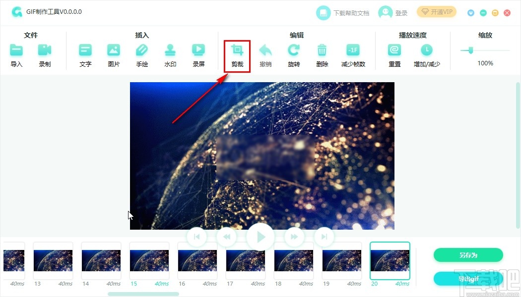 3.点击这个打开按钮之后,下一步我们就可以在软件界面看到添加的GIF文件了,然后下一步我们在界面上方找到剪裁功能图标并点击。