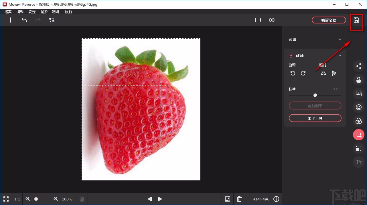 3.将图片添加到软件后,我们在界面右侧找到下图所示的裁剪按钮并点击,并在其左边选择“旋转”选项。