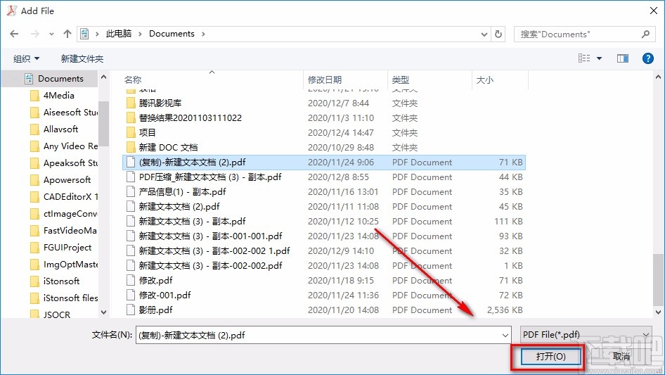 2.接着在文件添加页面中,我们选中需要压缩的PDF文件后,再点击页面右下角的“打开”按钮就可以了。