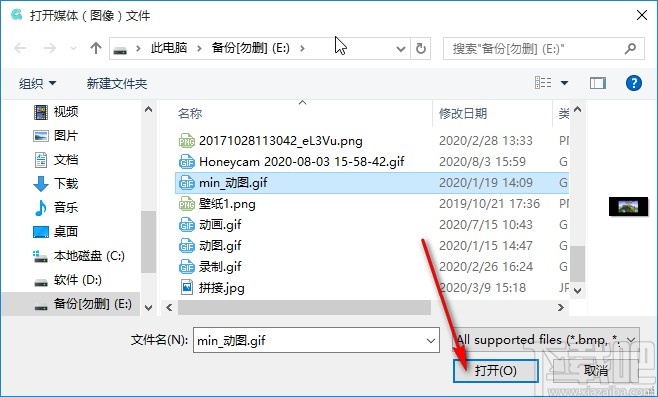 2.打开这个选择文件的界面之后,在界面中选择想要处理的GIF文件,找到之后选中它点击打开按钮。