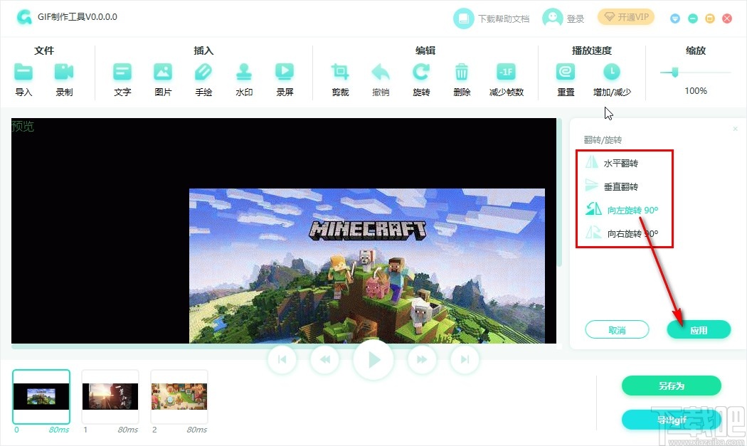 5.点击这个应用按钮之后就会应用旋转功能了,看到旋转之后的效果,可以点击右下角的导出GIF这个功能按钮准备导出GIF文件。