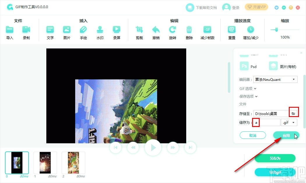 6.最后在出现的导出文件面板中,根据需求设置好存储路径和存储文件名称之后,点击应用按钮就可以了。