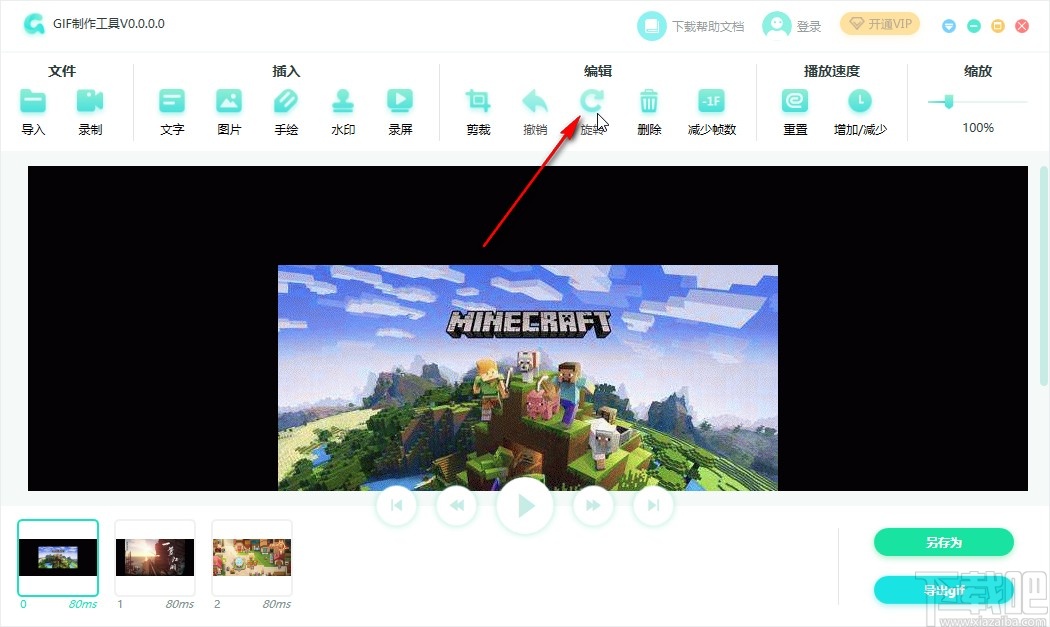 3.点击这个打开按钮将GIF成功添加到软件界面之后,可以看到界面中有旋转这个功能图标,如下图中所示,点击它进入到旋转功能界面。