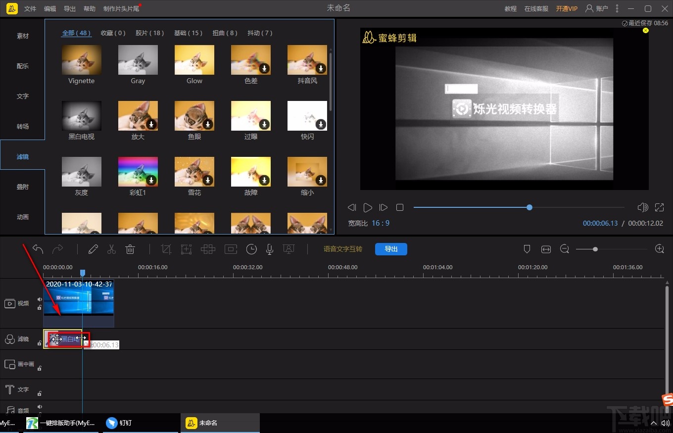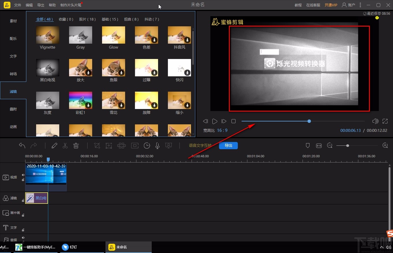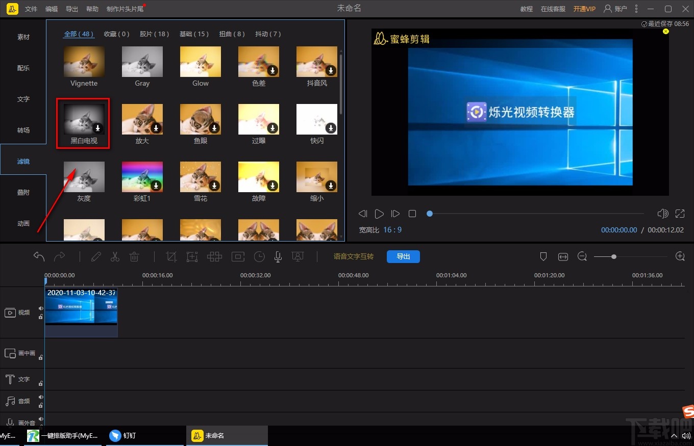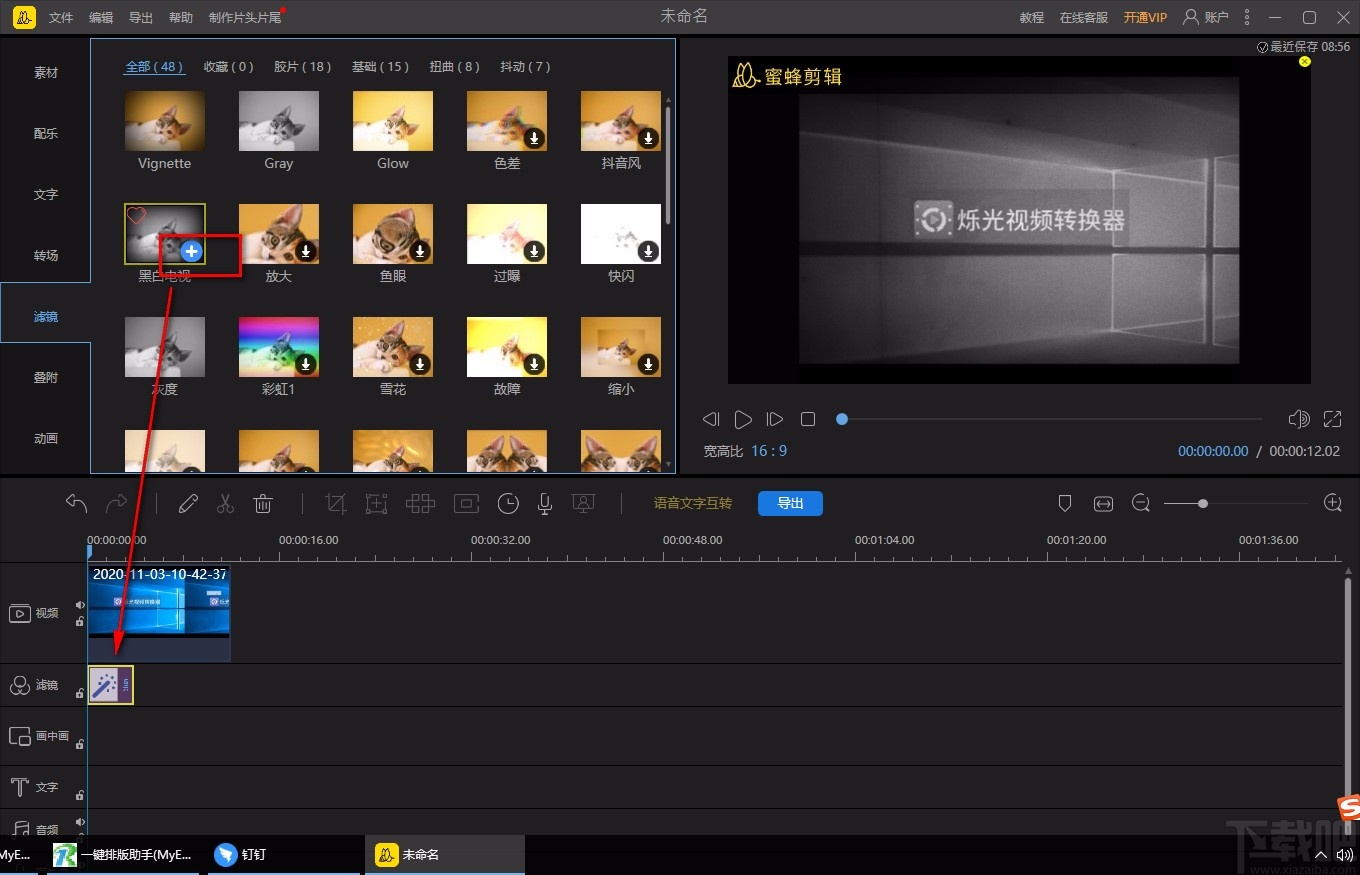 6.接下来将鼠标移动到滤镜素材上,会发现滤镜右下角会出现一个加号图标,我们点击该图标将滤镜添加到下方的时间时间线上。