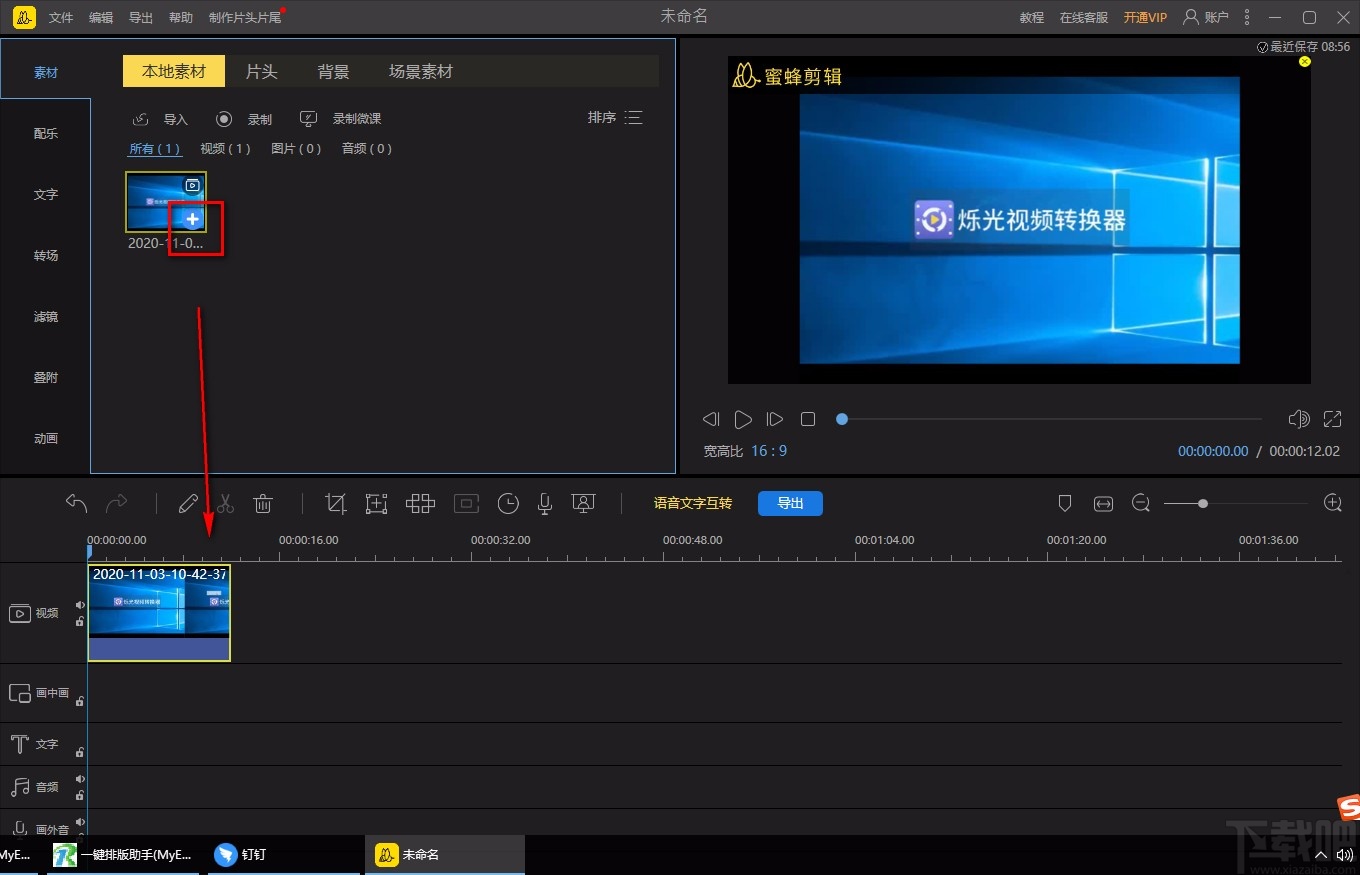 3.将视频添加到软件后,我们将鼠标移动到视频上,会发现视频上会出现一个加号图标,我们点击该图标就可以将视频添加到下方的时间线上。