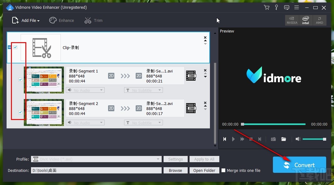 7.设置好输出保存路径之后,最后勾选剪切好的片段,然后点击软件界面右下角的这个Convert这个转换按钮就可以开始转换保存剪切视频文件了。