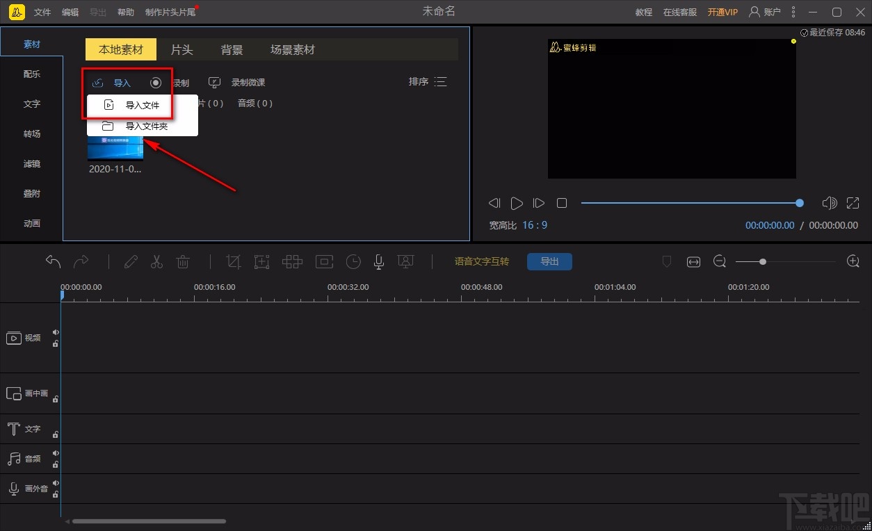 1.首先打开软件,我们在界面左上方点击“导入”按钮,其下方会出现一个下拉框,我们在下拉框中选择“导入文件”选项。