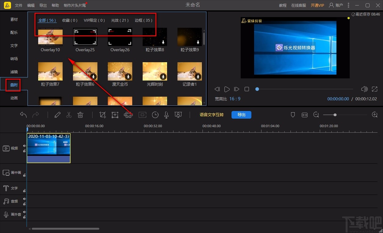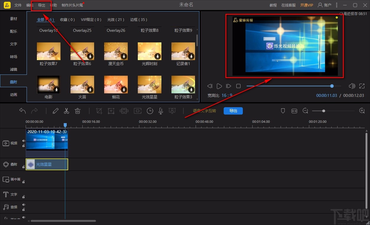 8.完成以上所有步骤后,我们在界面右上方的视频预览框中就可以查看到效果;这时候点击界面左上方的“导出”按钮,就可以成功将添加叠附后的视频导出软件了。