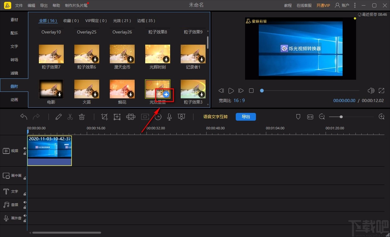 6.接下来将鼠标移动到刚刚下载的素材上,素材右下角会出现一个加号图标,我们点击该图标就可以将叠附素材添加到下方的时间线上。