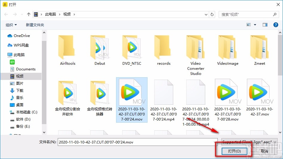 2.接着就可以打开文件添加页面,我们在页面中选中需要添加叠附的视频后,再点击页面右下角的“打开”按钮即可。