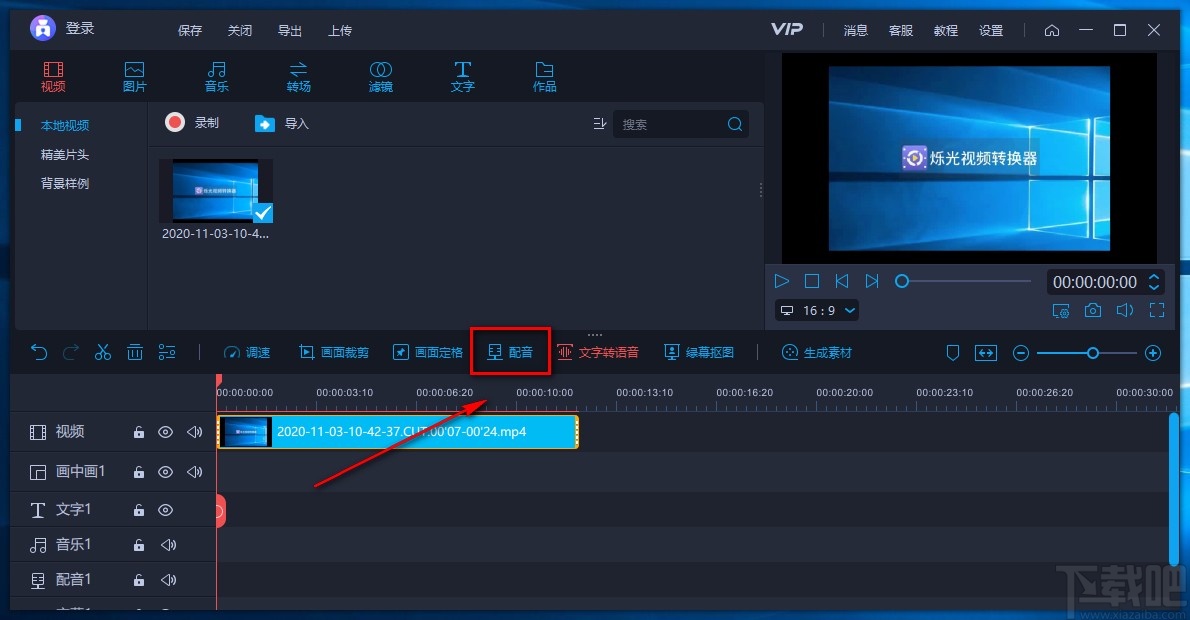 5.然后在时间轨道上方找到“配音”按钮,我们点击该按钮就可以开始给视频配音,如下图所示。