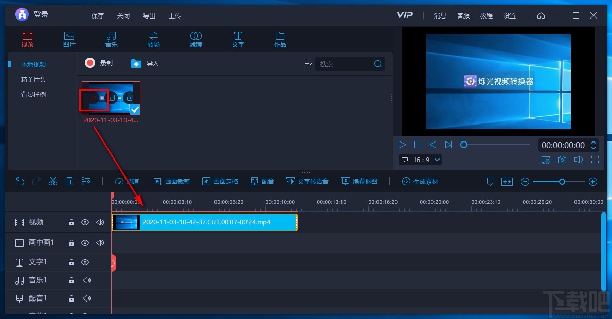 4.将视频添加到软件后,我们将鼠标移动到视频上,视频上会出现一个加号图标,我们点击该图标就可以将视频添加到下方的时间轨道上。