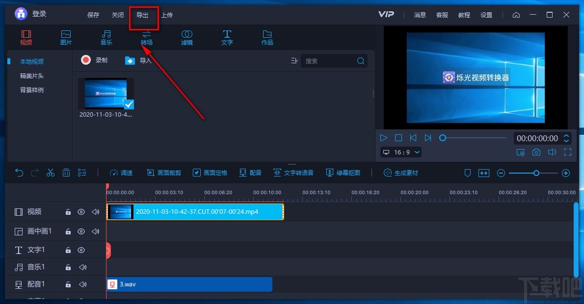 8.完成以上所有步骤后,我们在界面左上方找到“导出”按钮,点击该按钮就可以将配音后的视频导出软件了。