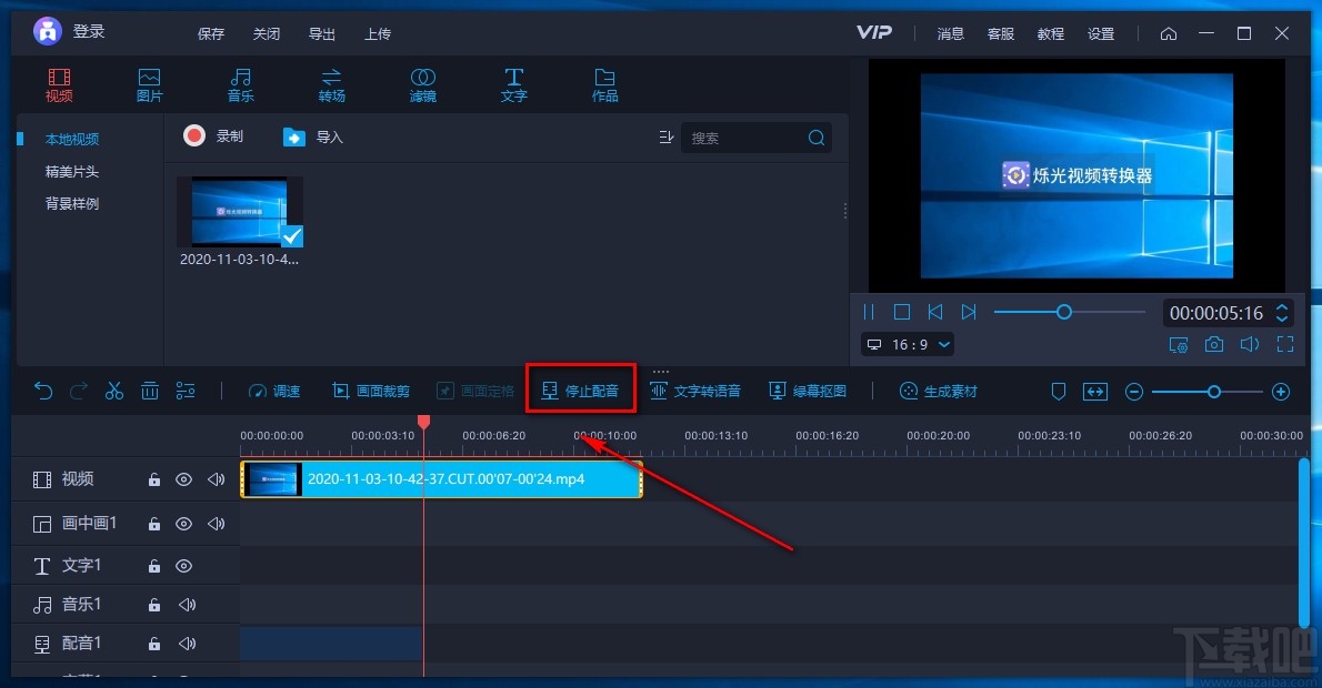 6.给视频配音结束后,我们在界面上方找到“停止配音”按钮,点击该按钮就可以结束配音。