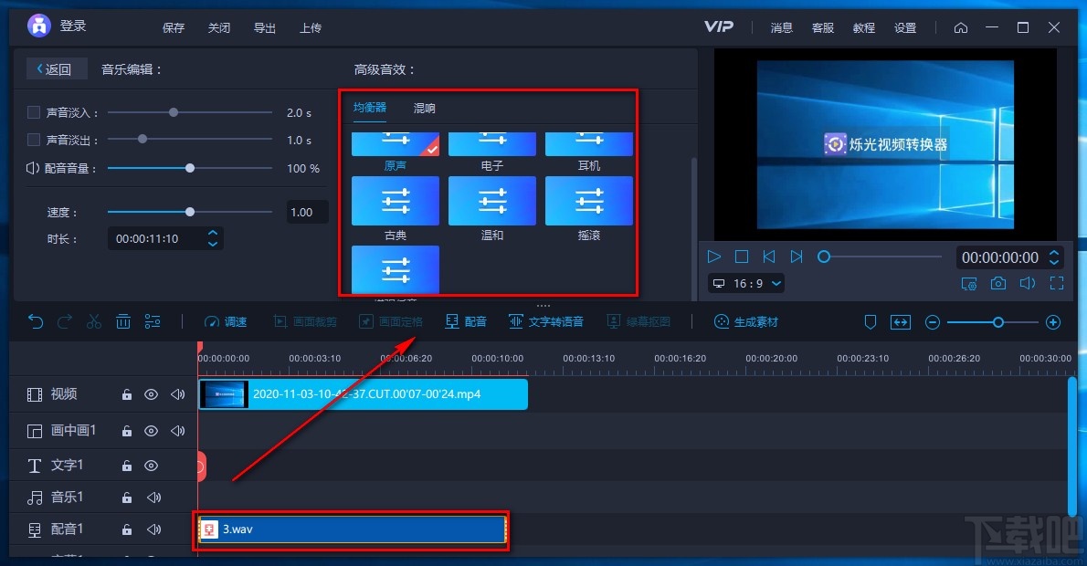 7.接下来在时间轨道上就可以看到一个配音文件,这时候双击配音文件,界面上方就会出现一个音乐编辑窗口,我们可以对音频的均衡器以及混响等参数进行设置,还可以对配音的音量进行调整。