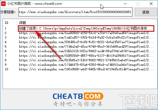 2.点击抓取按钮之后就会自动开始抓取链接中的图片了,可以看到第一行显示创建了目录,下载之后的图片就会保存到这个目录界面中。