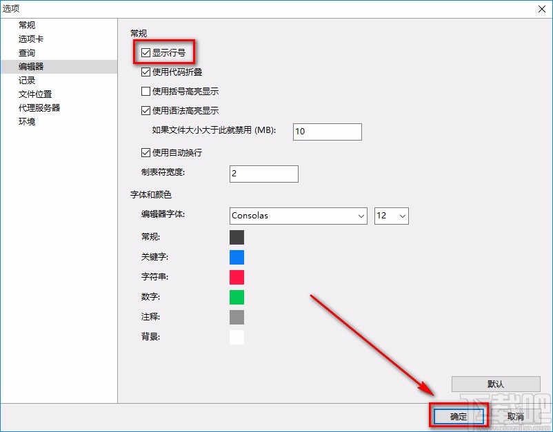 5.接下来在窗口上方找到“显示行号”选项,我们点击该选项使其前面的小方框中打勾,再点击窗口右下角的“确定”按钮就可以了。