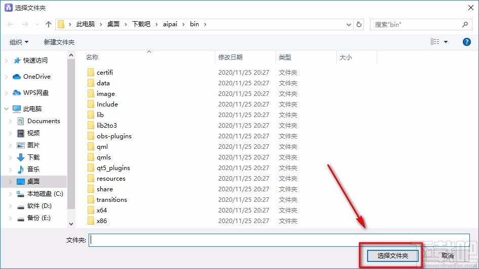5.接下来界面上会出现一个文件保存路径选择页面,我们在页面中选择好视频的导出路径后,再点击页面右下角的“选择文件夹”按钮就可以了。