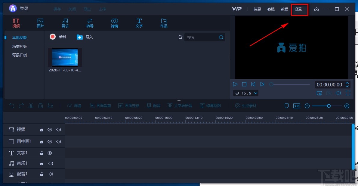 2.进入到视频编辑页面后,我们在页面右上角找到“设置”选项,点击该选项就可以打开设置窗口。