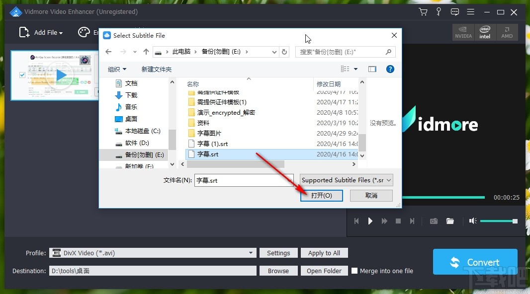 4.找到这个加号图标之后,下一步就会打开一个选择字幕文件的界面,在界面中根据自己的需求选择想要添加到视频的字幕文件,点击打开按钮即可。