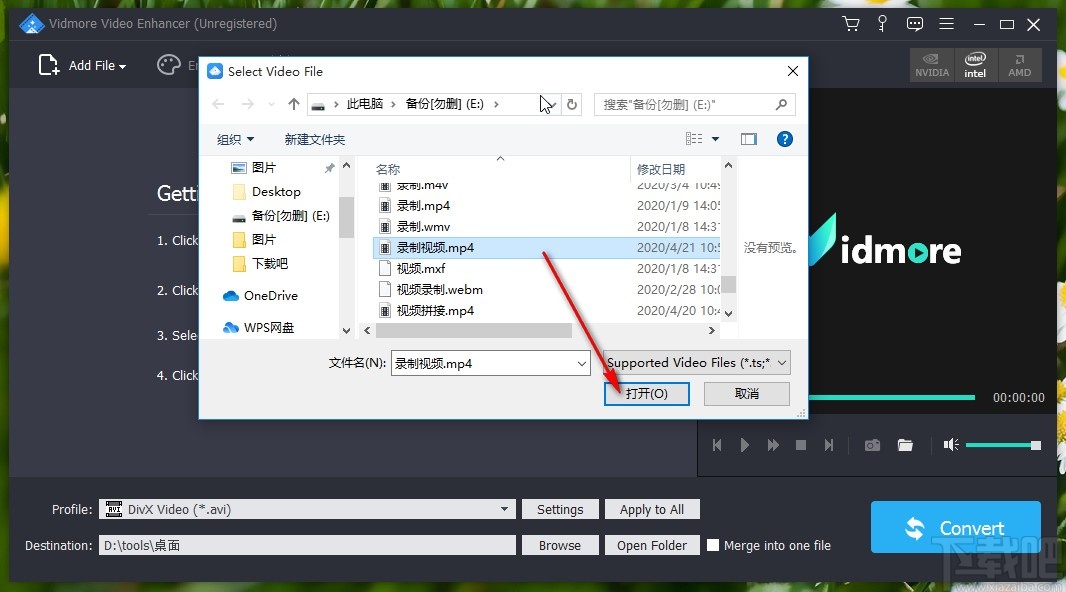 2.点击添加按钮之后,下一步在出现的选择文件界面中,找到想要处理的视频文件之后,选中这个视频文件点击打开按钮即可。