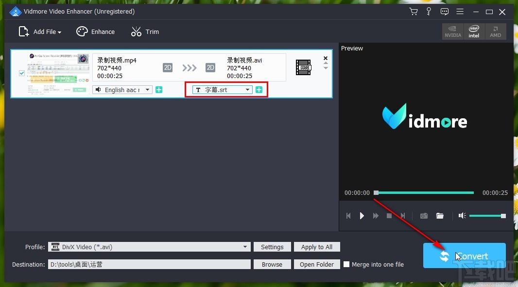 7.设置好输出文件夹之后,确认视频的字幕选择为刚才添加的字幕文件之后,点击界面右下角的Convert这个转换按钮即可将视频添加字幕并且保存下来。