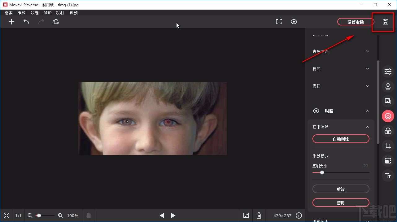 7.完成以上所有步骤后,我们在界面右上角找到保存按钮,点击该按钮就可以将消除红眼后的图片保存在电脑中了。