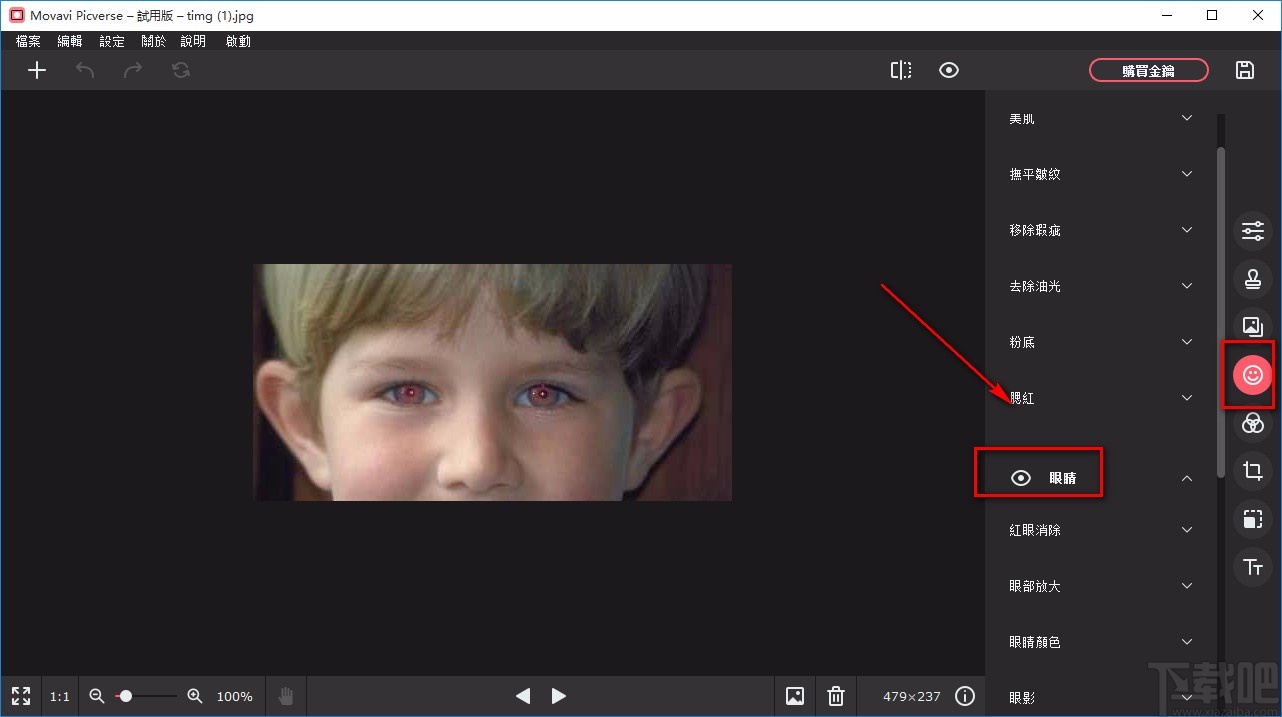3.将图片在软件中打开后,我们在界面右侧点击下图所示的笑脸按钮,并在其左边选择“眼睛”选项。